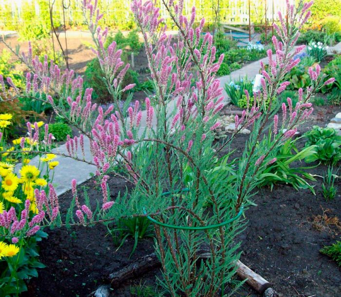 З другої половини травня і до останніх днів серпня верхівки пагонів прикрашають гроновидні суцвіття рожевого забарвлення. Пишні суцвіття, причому спочатку розпускаються нижні бутони. Суцвіття дуже важкі, тому часто стеблини нахиляються до землі, знаходячи дугоподібну форму. До того як квіти почнуть розпускатися, квітконіс має довжину близько 10 сантиметрів і зовні схожий з щільною шишкою. Але з часом його довжина збільшується до 0,3–0,4 м, а сам він стає менш щільним.