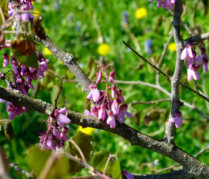 Рожеві бруньки, з яких через деякий час розкриття квітки, утворюються на гілках і стовбурі ще до того, як розпустяться листові пластини. Бруньки утворюються в листових пазухах або на поверхні кори, причому сидять вони дуже міцно. Цвіте кущ протягом 30 днів і відцвітає, як тільки листові пластини повністю розкриються. Форма квіток неправильна, а вони входять до складу щільних гроновидних суцвіття або пучків. У віночок квітки зовні схожий з дрібним метеликом, а його чашечка має дзвоникоподібної форми. Квітка складається з коротенької зав'язі, 10 недовгих тичинок і п'яти пелюсток насиченого фіолетового або рожевого забарвлення.