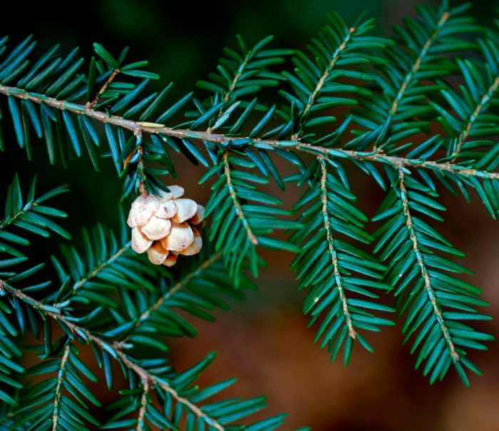 На гілках утворюються шишки веретеноподібної форми, які в довжину досягають близько 25 мм. протягом першого року спостерігається дозрівання шишок, а облітають вони лише на другий рік свого зростання. Сплощені листові пластини можуть бути пофарбовані в різні відтінки від зеленувато-жовтого до глянцевого зеленого відтінку. На виворітній поверхні листя є 2 смуги білого кольору, в склад яких входить кілька устьичных ліній.