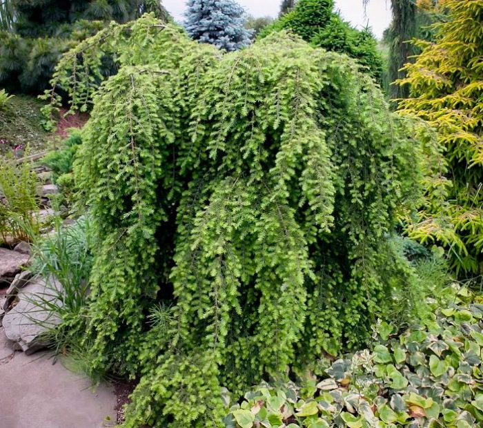У цього красивого деревця плакучі стебла, що звисають настільки низько, що дістають поверхні грунту.