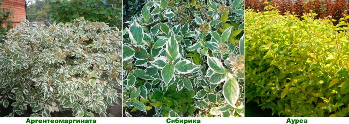 - Сібіріка Варієгата ― у двометрового листя чагарнику прикрашена широкою облямівкою вершкового відтінку, а ще кремовими штришками і цятками, в осінній час вона набуває пурпурний відтінок, сорт схожий з Элегантиссимом, однак він росте більш повільно, що дозволяє оздоблювати маленькі сади;