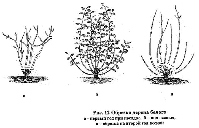 Після того як чагарнику виповниться 3 роки, починають проводити систематичні формують обрізки. Якщо ж знехтувати цим правилом, то біля білого дерена незабаром почнеться поступове оголення нижній частині куща. Щоб чагарник був завжди компактним і привабливим у нього слід повністю зрізати кожен третій або четвертий стебло. Також вирізують всі ослаблені, травмовані та хворі гілки, залишаючи тільки найбільш міцні і розвинені. Якщо білий дерен використовується для створення живоплоту, то першу його стрижку слід провести в липні, а повторну ― у серпні (коли відросте стебла).