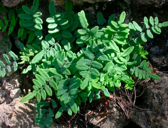 Таке рослина має досить ефектним зовнішнім виглядом. Стебла у висоту досягають до 0,35 м. Листя формується на оголених пагонах темно-коричневого кольору. Вид потребує великої кількості світла і відрізняється високою морозостійкістю.