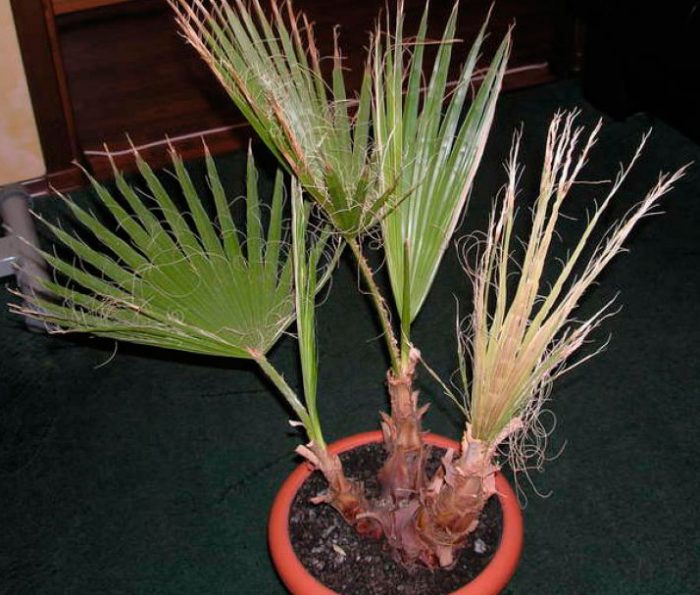 - Облетание листя. Якщо вологість повітря дуже низька пальма починає скидати листя.