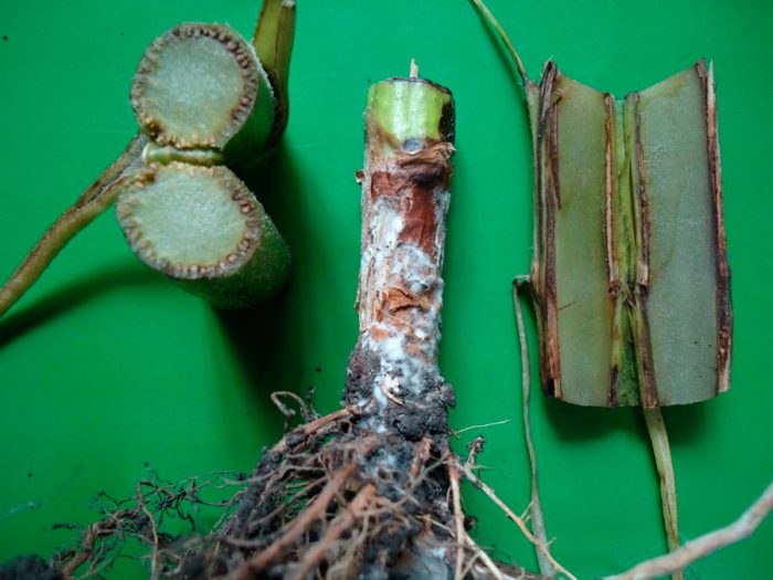Бактеріоз є бактеріальним захворюванням. Хворі тканини загнивають і стають слизькими, в'януть і засихають.