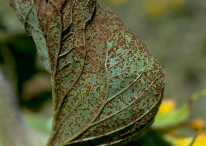 Така грибкова хвороба як іржа широко поширена там, де культивується соняшник. У весняний час на виворітній, а в деяких випадках і на лицьовій поверхні листових пластин з'являються опуклі освіти оранжевого кольору подушкообразной форми, які іменуються пустулами, коли вони розтріскуються, з них висипається іржавий порошок, який представляє собою спори грибка. Іржею уражується листя, в результаті вона гине, однак якщо зараження дуже сильне, то можуть постраждати й інші частини куща. Хворі рослини поступово втрачають вологу, у них порушуються обмінні процеси, а ще вони відстають у розвитку.