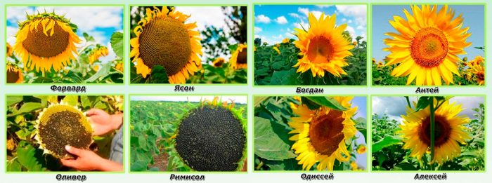 - Форвард. Середньоранній масляний гібрид характеризується високою врожайністю і стійкістю до склеротинії, пероноспорозу, різноманітним гнилей, фомопсису та смітної траві. Висота куща близько 1,9 м. Опущені вниз опуклі кошики в діаметрі досягають від 15 до 20 сантиметрів, забарвлення насіння темний смугастий.