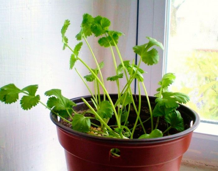 При бажанні коріандр можна виростити на своєму підвіконні, в цьому випадку свіжа зелень буде на вашому столі постійно. У такий зелені міститься велика кількість вітамінів і інших речовин, які дуже корисні і необхідні людському організму. На розсаду насіння висівають з початку до середини березня. Насіння необхідно рівномірно розподілити по поверхні зволоженим грунтосумішей, дотримуючись між ними дистанцію близько 70 мм, при цьому їх заглиблюють в субстрат приблизно на 10-15 мм. Посіви йдуть зверху накрити прозорим поліетиленом або склом, а потім ємність ставлять у тепле і добре освітлене місце. У тому випадку, коли світловий день ще надто короткий над посівами потрібно встановити фитолампу або лампу денного світла на висоті від 20 до 25 сантиметрів.