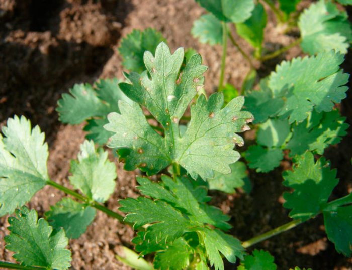 - Полив. Посіви треба поливати рясно і систематично. Коли здадуться сіянці, полив необхідно скоротити, при цьому грунт на ділянці повинен бути весь час трохи влажноватым. Після того як у кущів почнеться активний ріст зеленої маси, їх треба знову почати поливати рясно, в іншому випадку вони підуть в колір. Під час дозрівання плодів поливати кінзу знову слід бідно.