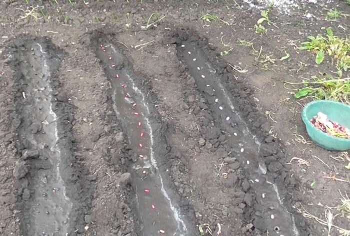 Кущові сорти висівають на глибину від 50 до 60 мм, при цьому дистанція між кущиками повинна бути від 20 до 25 сантиметрів, а відстань між рядами ― близько 0,4 метрів. При висіві витких сортів дистанція між рослинами повинна бути від 25 до 30 сантиметрів, а відстань між рядами близько 0,5 м. В одну лунку висаджують по 5 або 6 насіння. Після того як здадуться сіянці, в одній лунці потрібно залишити лише 3 з них найбільш міцних, при цьому зайві слід пересадити. Посіви треба полити, а потім грунт утрамбовують зворотною стороною грабель. Якщо є небезпека зворотних весняних заморозків, то поверхню грядки потрібно вкрити плівкою.