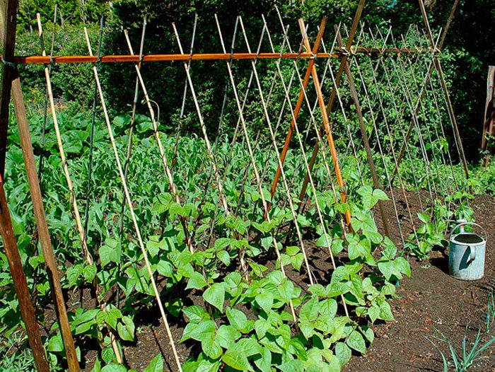 - Підв'язка. Такій культурі необхідні опори, висота яких повинна бути близько півтора метрів. На них слід натягнути дріт. Для фіксації стебел квасолі до напрямних потрібно використовувати мотузку або шпагат. Також біля кожного кущика можна встановити кілок, з нього будуть підійматися виткі стебла цієї рослини.