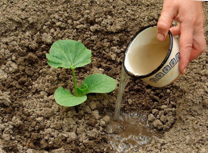 Розсада, яка була висаджена у відкритий ґрунт зовсім недавно, має потребу в систематичному поливі, який проводять кожен день до тих пір, поки вона добре вкоренитися. Потім поливи повинні стати дуже рідкісними до того моменту, поки величина зав'язі не буде дорівнює кулаку. Якщо в літній час регулярно йдуть дощі, тоді можна і не поливати гарбуз.