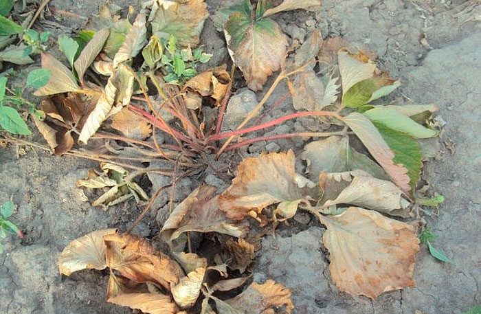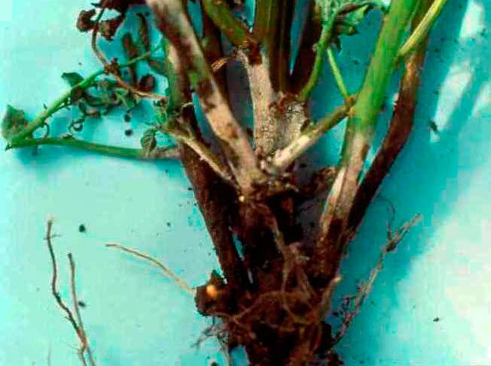 Це грибкова хвороба, розвиток якої відбувається в 4 етапи. У уражених кущиків спостерігається відставання в розвитку, вони практично не дають стебел. В останні тижні літнього періоду кущі раніше часу стають жовтими, і у них дуже рано закінчується вегетаційний період, при цьому система коренів не встигає сформуватися, а біля основи пагонів не встигають закластися нирки, а це вкрай негативно позначається на майбутньому врожаї. Як правило, цієї хвороби схильні ті кущики, які ростуть на ділянках з влагопроніцаємой грунтом, а також з високим заляганням ґрунтових вод. Також захворювання починає інтенсивно розвиватися в сиру дощову погоду.
