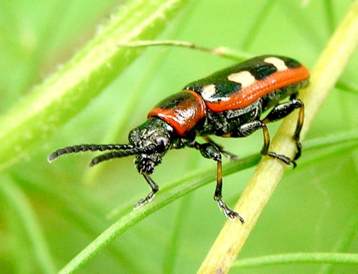 Такий шкідник був завезений з Західної Європи разом з даною культурою. Цей жук має темно-синім забарвленням, при цьому на спині у нього є червона облямівка. Він поїдає квітки, плоди і зелень спаржі. Його поява відбувається у весняний час, однак з середини літнього періоду спостерігається найбільша кількість шкідників.
