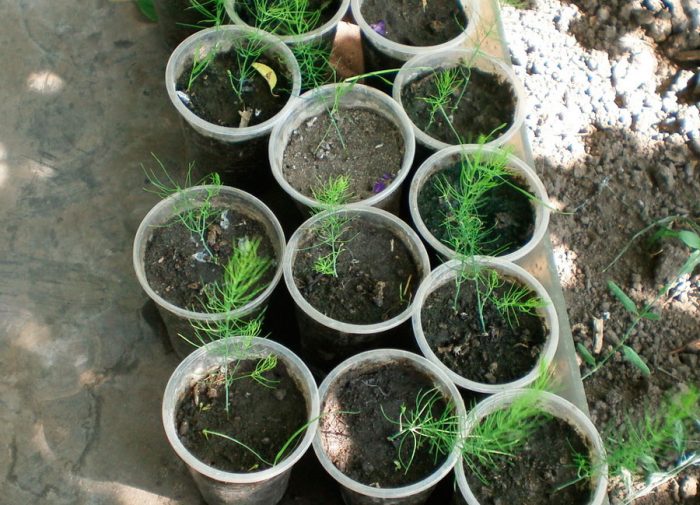 Пікірувати сіянці спаржі потрібно лише в тому випадку, якщо для посіву використовувався загальний ящик. Після того, як висота рослинок досягне 15 сантиметрів, слід провести їх пересадку в ємність більшого обсягу, при цьому дистанція між ними повинна бути близько 10 сантиметрів. Під час пересадки корінь у сіянців трохи вкорочують. Коли пройде кілька діб після пікіровки, спаржу потрібно підживити. Ще 7 днів кущики починають загартовувати, а після того, як розсада зможе перебувати на вулиці цілодобово, її пересаджують у відкритий грунт.