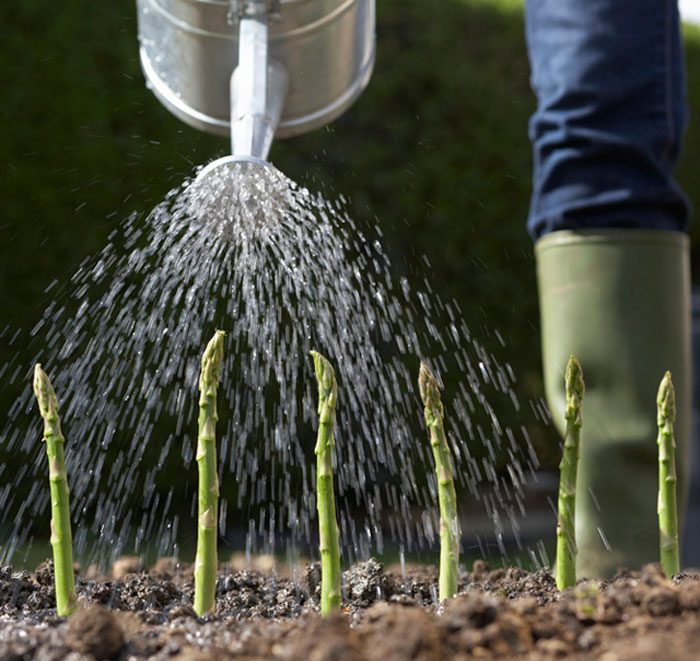 Спаржа є некапризным рослиною. Доглядати за нею потрібно точно так само, як і за багатьма іншими городніми культурами. Її треба своєчасно поливати, прополювати, підгодовувати, а також спушувати поверхню грунту між рядами та біля кущиків. Розпушувати грунт на глибину від 60 до 80 міліметрів, при цьому потрібно постаратися не травмувати корінці рослин. Між рядами рекомендується перші 2 роки ростити зелені культури.