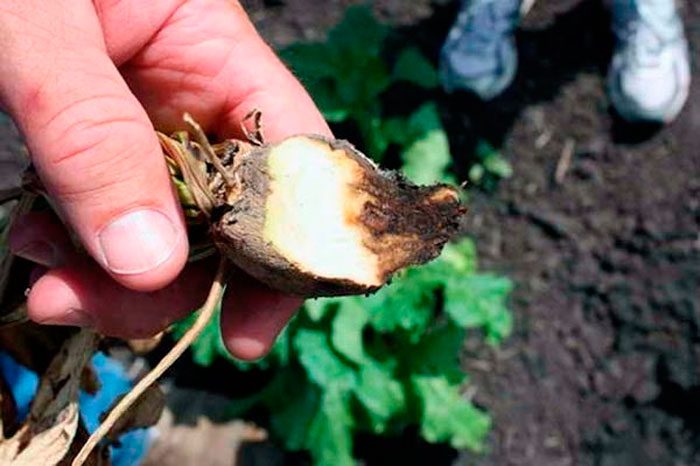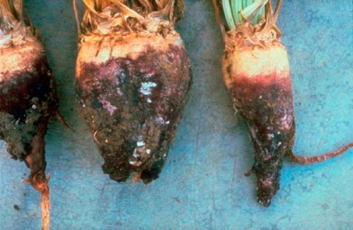Поразка даної культури фузаріозною гниллю відбувається в перші літні тижні, а бурою ― у середині літа. Уражаються такою хворобою рослини, які були ослаблені посухою і спекою або травмовані під час розпушування. У хворих кущиків нижні листові пластини в'януть, а черешки у підстави стають чорними. Коренеплоди розтріскуються, при цьому в тріщинах з'являється субстанція білого кольору.