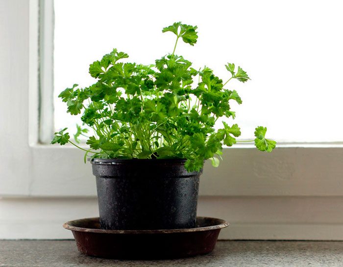 Після того як через 15-20 днів здадуться перші сіянці, ємність з посівами потрібно перенести на підвіконня. Коли сходи підростуть, їх потрібно прорідити, при цьому дистанція між рослинками повинна бути не менше 40 мм. Оптимальна температура повітря для вирощування петрушки від 15 до 20 градусів. Якщо в кімнаті буде холодніше, то зростання рослинок стане більш повільним, а в жарі сходи засихають. Щоб сіянці росли нормально, їм необхідний тривалий світловий день. Якщо ж він коротший, ніж це необхідно, то петрушці знадобиться додаткове штучне освітлення, для цього на відстані 0,6 м необхідно розмістити люмінесцентну лампу. Приблизно через 6 тижнів можна буде зібрати перший урожай. Коли висота гілки досягне 10-12 сантиметрів, її при необхідності можна зірвати і використовувати для приготування їжі, при цьому в ємності повинна залишитися частину стебла з 1/3 листових пластин.
