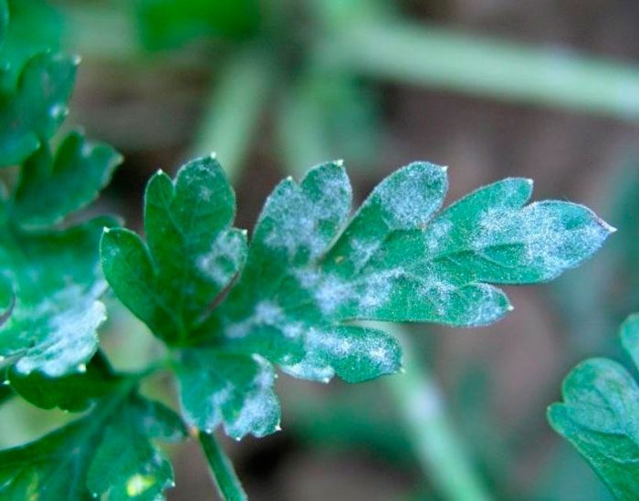 При ураженні рослини такий грибковою хворобою на його поверхні надземних частин утворюється пухкий наліт практично білого забарвлення. По мірі розвитку захворювання на даному нальоті з'являються точки чорного кольору, які є плодовими тілами грибка. У таких кущів сильно погіршується репродуктивна здатність. Ця недуга активно розвивається в сиру погоду, якщо при цьому спостерігаються різкі коливання температур. В цілях боротьби з такою хворобою, після того, як буде зібраний урожай петрушки, ділянка треба обов'язково очистити від рослинних залишків, які слід знищити. Потім ґрунт обробляють розчином Байлетона, при цьому потрібно строго слідувати інструкції.