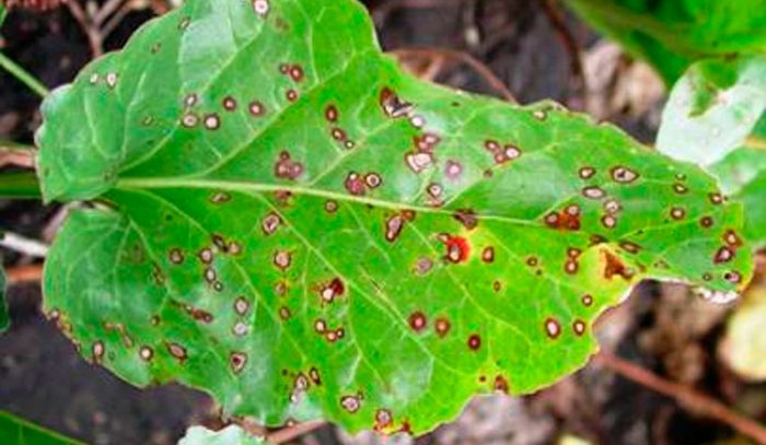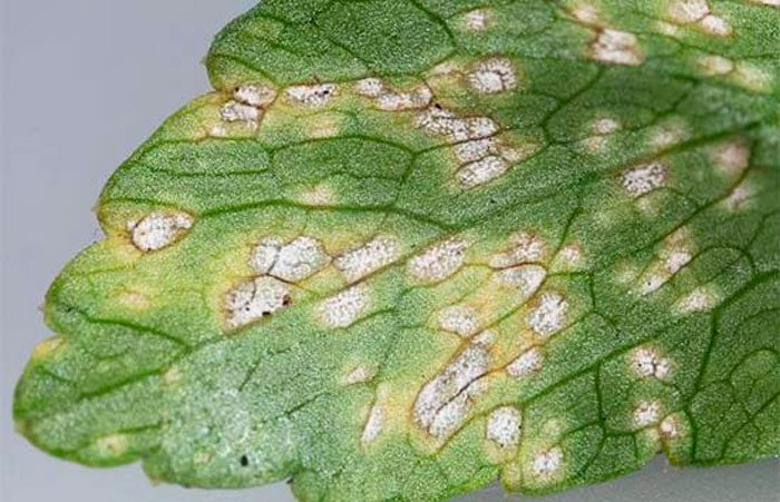 На поверхні пагонів і листя ураженого кущика утворюються бурі або блідо-жовті плями, в діаметрі досягають близько 0,6 см і володіють неправильною формою. При підвищеній вологості на поверхні плям з'являється наліт світло-сірого забарвлення. У хворих кущів спостерігається відставання в рості, а також пожовтіння і засихання листя. Хвороба активно розвивається вдень, якщо стоїть волога і тепла погода, а також туманними ночами і якщо в ранковий час випадає рясна роса. Якщо хвороба тільки починає розвиватися, ділянку потрібно обприскати розчином бордоської суміші (1%). Якщо це потрібно, то подібне обприскування проводять ще кілька разів з перервою 10-12 діб. Останній раз обприскати кущі необхідно не пізніше, ніж за півмісяця до збору врожаю.