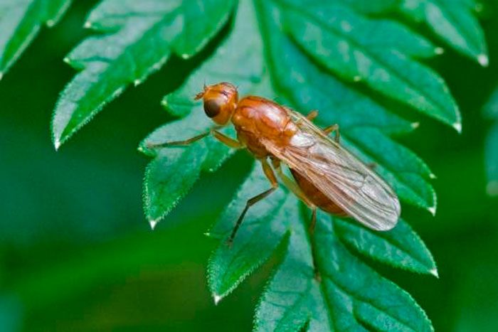 Довжина такого шкідника всього півсантиметра, він володіє з зеленим відливом забарвленням. Така муха воліє вологі місця. Якщо вона оселиться на грядці з петрушкою, то у кущиків буде спостерігатися відставання в розвитку, а листя стане фіолетово-червоним, потім жовтої і, врешті-решт, вона відімре. Якщо петрушка росте неподалік від моркви, то ймовірність того, що на кущиках оселитися така муха, сильно зростає, тому що цього шкідника приваблює морквяний запах. Для маскування сильного запаху моркви, її кущики рекомендується обробити розчином, що складається з 1 відра води, 1 ст. л. червоного або чорного меленого перцю і 1 ч. л. рідкого мила. А ще можна поверхня ґрунту між рядами засипати шаром суміші, що складається з піску і нафталіну (10:1). Так як на зимівлю такий шкідник забирається в грунт, після збору врожаю в осінній час рекомендується обов'язково провести глибоку перекопування.