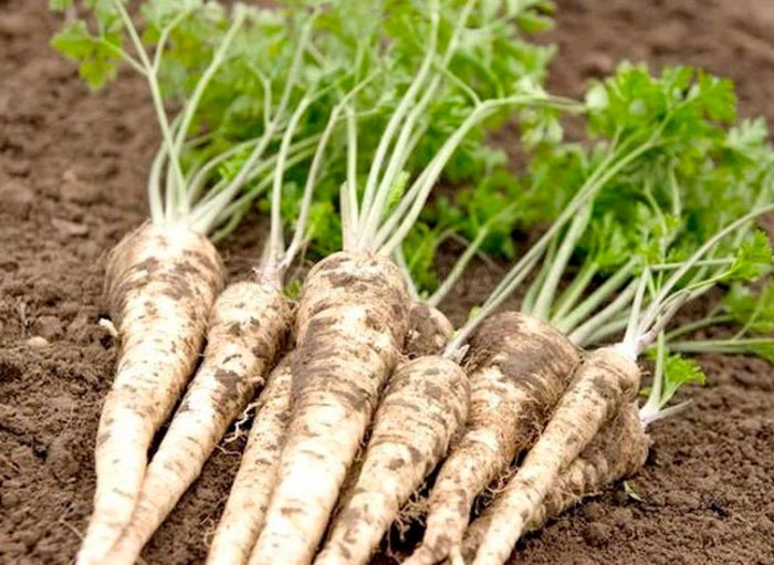Протягом першого року росту у кущиків формується листкова розетка і коренеплід, який схожий на морквину, він забарвлений в блідо-жовтий або білий колір. А на другий рік кущики дають насіння. Коренеплоди петрушки володіють лікувальними властивостями, вони допомагають зберегти зір, загоїти рани, зміцнити ясна, а також стимулюють ниркову діяльність. До їх складу входять солі калію, заліза і фосфору. Такий коренеплід застосовують як прянощі, додаючи її в супи і розсоли, а також в маринади при консервуванні.