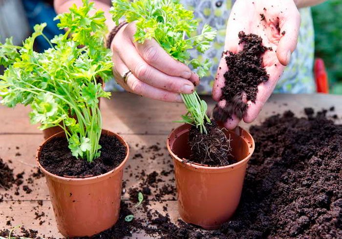 Даний метод вирощування петрушки дозволяє не чекати появи сіянців. В останні дні жовтня, перед тим як почнуться заморозки, кущ петрушки необхідно витягти з землі з корінцями довжиною близько 50 мм, а також шириною приблизно 40 мм. Для знезараження розсадного ящика потрібно використовувати міцний розчин марганцевого калію, на його дні необхідно зробити дренажний шар, поверх якого насипається грунтосуміш для фіалок. У неї практично впритул один до одного слід посадити коріння цієї рослини, які були викопані в городі, при цьому над поверхнею субстрату повинні підніматися лише верхівкові бруньки. Землесуміш треба трохи ущільнити і добре полити, після цього ємність переносять на необігріваєму веранду або на утеплений балкон. Рослинам потрібно забезпечити помірний полив, а після появи зелених росточков ємність переносять в добре освітлене і тепле (близько 20 градусів) приміщення. Молодим растеньицам в хмарний день буде потрібно додаткове освітлення. Після того як почнеться активний ріст зеленої маси, полив слід зробити більш частим і рясним. Якщо все зробити правильно, то вже до новорічних свят наросте свіжа ароматна зелень.