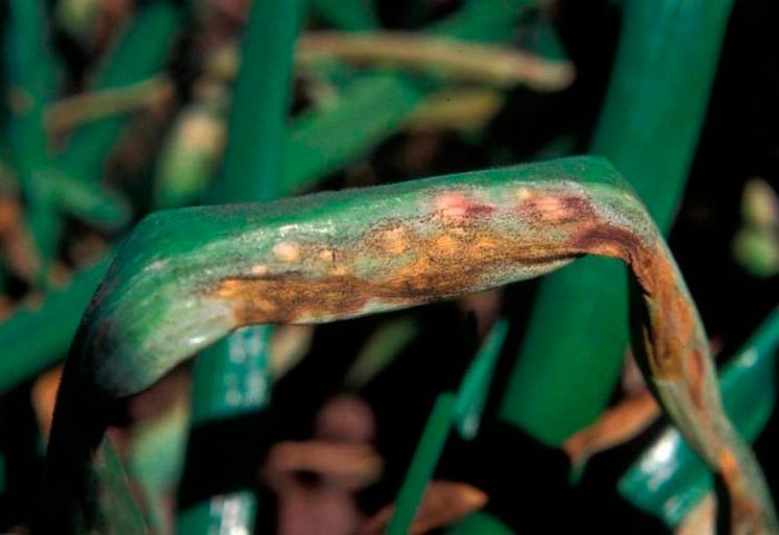 Іржа ― на листі ураженого цибулі з'являються червоно-бурі здуття, в яких знаходяться спори грибка. В цілях профілактики перш прибрати на зберігання зібраний урожай його протягом 10 год прогрівають при температурі близько 40 градусів. Також не слід допускати загущення посадки, а ще необхідно вчасно викопувати і знищувати уражені екземпляри.