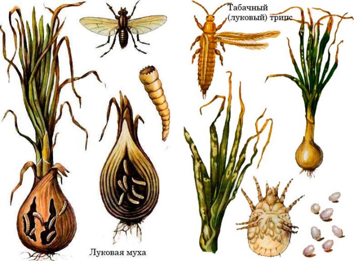 Найбільшу небезпеку для лука представляє цибульні прихованохоботник, міль і муха, паросткова муха, капустянка, капустяна, городня та озима совки і тютюновий трипс.