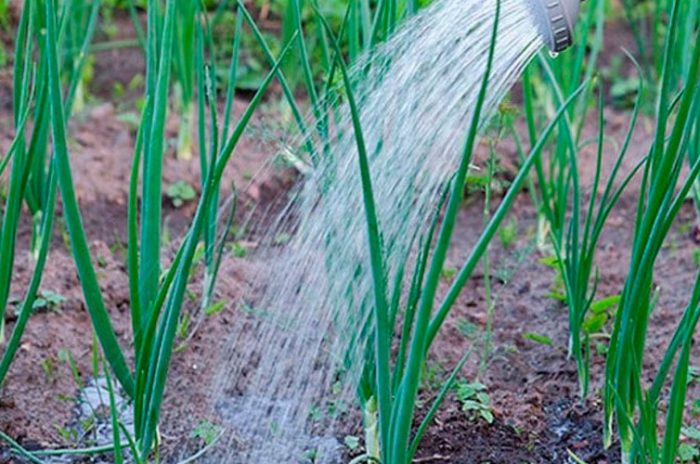 В ідеалі цибулю слід поливати 1 раз у 7 днів, при цьому на 1 квадратний метр ділянки береться 5-10 літрів води. Проте краще всього орієнтуватися на погоду, яка дуже мінлива. Так, якщо стоїть посуха, то цибулю необхідно поливати набагато частіше (майже кожен день), а якщо ллють дощі, то з поливами треба почекати, інакше цибулини можуть згнити із-за застою води в грунті. Слід пам'ятати, що якщо цибуля потребує термінового поливі, то його пір'я набувають біло-сизий відтінок, а коли в грунті спостерігається застій води, то зелена частина кущиків стає невиразною. Почати поступово скорочувати поливи необхідно в липні, так як в цей час починається визрівання цибулин. Однак якщо стоїть сильна посуха, рослини поливають в тому ж режимі, що і до цього.