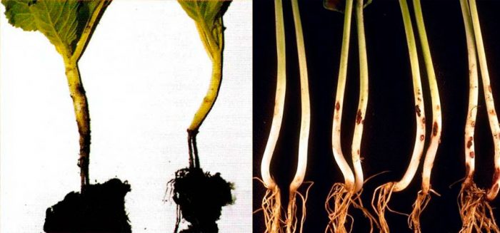 Дуже часто розсаду капусти або молоденькі кущі, висаджені у відкритий грунт, вражає чорна ніжка. Ця грибкова хвороба уражує кореневу шийку біля основи стебла. З розвитком хвороби уражені частини рослини стають чорними, відбувається їх витончення і гниття, зростання капусти стає більш повільним і, зрештою, вона гине. Уражена розсада загине в будь-якому випадку, тому немає сенсу висаджувати її на грядку. Якщо ж хворі рослини загинули від чорної ніжки при вирощуванні на грядці, то землю на ній треба обов'язково замінити, так як її не можна більше використовувати для вирощування капусти. У профілактичних цілях перед висівом слід піддати обробці посівний матеріал і грунт. Для обробки посівного матеріалу використовують гарнозан (дотримуйтесь інструкції), при цьому для того, щоб обробити 100 штук насіння, достатньо буде 0,4 грам кошти, а в грунт слід внести Тирам (ТМТД) (50%), на 1 квадратний метр ділянки береться 50 грам.