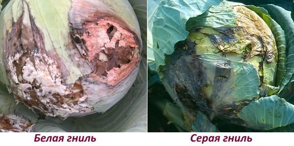 Розвиток білої гнилі відбувається в тому випадку, якщо на вулиці стоїть сира і прохолодна погода. У уражених кущиків спостерігається ослизнение зовнішніх листових пластин, при цьому між ними формується білий ватообразний міцелій з склероциями чорного забарвлення, величина яких 1-30 міліметрів. Заражений вилок, що знаходиться у сховищі, починає гнити, при цьому захворювання поширюється і на інші качани, розташовані поруч. В процесі зберігання також виявляються симптоми ураження сірою гниллю. Так, у нижніх листових пластин на поверхні черешків утворюється пухнаста цвіль з бісером точок чорного забарвлення. Щоб уберегти капусту від даних хвороб необхідно: перед висівом дезінфікувати посівний матеріал, дотримуватися агротехнічних правил даної культури, очищати і дезінфікувати сховища перед закладкою качанів, правильно зберігати, проводити систематичні огляди вілков, а також при необхідності зачищати уражені ділянки.
