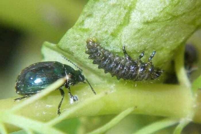 Цей маленький жучок, в довжину досягає 0,5 см, має яйцевидної форми. Він травмують листові пластини, проробляючи в них дірочки або проїдаючи виїмки по краю. Листоїди влаштовуються на зимівлю в грунт, самки влаштовують свої яйцекладки, через 10-12 діб з яєць вилуплюються личинки, які харчуються, зскрібаючи шкірку з листових пластин. У профілактичних цілях з ділянки треба виривати всю бур'янисту траву, яка відноситься до сімейства Капустяні. Щоб відлякати даного шкідника, необхідно кожен день вранці обробляти кущики по росі сумішшю, що складається з деревної золи або гашеного вапна і тютюнової пилу (1:1). До того як почнуть формуватися качани, для обробки рослин можна використовувати розчин Актеллика (2%) або біопрепарату Банкола, який відрізняється меншою токсичністю.