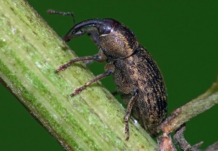 Він являє собою жучка, пофарбованого в чорний колір і має довжину приблизно 0,3 див. Небезпеку для рослини представляють його личинки, які в черешках листових пластин прогризають ходи, через які проникають в стебло, і по виконаних в ньому тунелях спускаються в кореневу систему куща. У результаті відбувається пошкодження провідної системи, листя стає жовтим, припиняється розвиток рослини і незабаром вона гине. Щоб винищити цього жучка, в осінній час з ділянки треба обов'язково прибирати всі рослинні залишки, а також виробляти перекопування грунту. Протягом вегетаційного періоду потрібно вчасно видаляти з грядки бур'янисту траву, а ще своєчасно викопувати і знищувати уражену скрытнохоботником капусту. Щоб винищити даного шкідника, можна скористатися Фосбецидом або Актеліком, але подібна обробка допустима лише на ранній стадії розвитку сіянців у відкритому ґрунті.