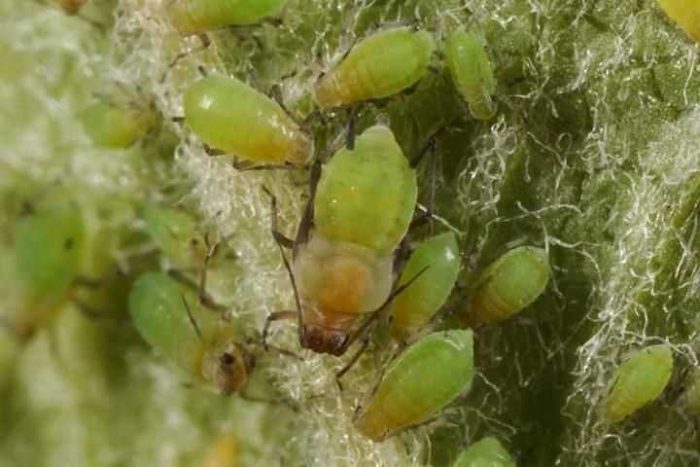 Попелиця ― це дуже небезпечний шкідник, здатний сильно нашкодити базиліку. Він висмоктує сік з пагонів та листя, з-за чого спостерігається згортання листових пластин, припиняється розвиток пагонів, а сам кущ починає всихати. Такий шкідник залишає на поверхні рослини цукристі виділення, на яких воліє селитися сажістий грибок, із-за чого кущик покривається нальотом темного забарвлення. Крім цього даний шкідник вважається головним переносником вірусних хвороб, які на сьогодні не лікуються. Приступати до боротьби з попелиць слід відразу ж після її виявлення. З нею можна боротися народними засобами, наприклад, відваром полину, пижма, гіркого перцю, кульбаби, деревію, цибулі, часнику, бадилля томатів або картоплі, гірчиці. Буде потрібно 2-3 обробки з інтервалом в 1-1,5 тижня у тому випадку, якщо ця культура вирощується у відкритому грунті. Досить ефективним вважається засіб, приготований з 100 грамів дегтярного мила, подрібненої за допомогою терки, і 1 відра води. Також непогані результати показує розчин золи, для його приготування необхідно 300 грам деревної золи змішати з тільки що скипіла водою, суміш повинна прокипіти протягом 30 хв. Коли вона відстоїться, її проціджують, потім у розчин доливають стільки води, щоб його обсяг дорівнював 10 літрам. Якщо шкідників дуже багато, то народні засоби можуть виявитися безсилими, в цьому випадку проводять обробку кущиків Карбофосом, при цьому розчин потрібно робити у відповідності з інструкцією. Слід врахувати, що даний інсектицидний препарат не володіє запахом, а також є невдалим. Так, найкраще для обробки підійде Банкол, Акарин і Актеллік.