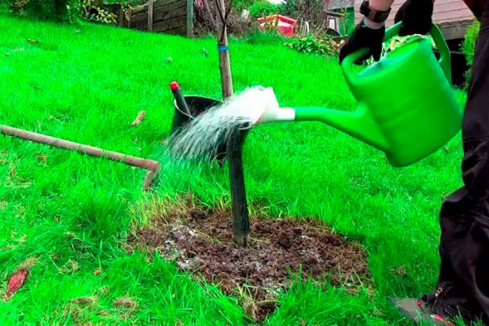 Коли яблунька буде посаджена, потрібно добре ущільнити грунт в пристовбурового колі, для цього його треба притоптати. Потім потрібно відступити від стовбура приблизно 50 сантиметрів і зробити п'ятнадцятисантиметрової висоти валик. Вилийте після цього в пристовбурні кола 2,5–3 відра води. Після повного всмоктування рідини в грунт поверхню пристовбурового кола треба засипати трехсантиметровым шаром мульчі (торфом або перегноєм). Після чого проводиться підв'язка рослини до кілочка.