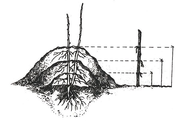 Для такого способу розмноження добре підходять дворічні саджанці карликової підщепи. Його слід посадити у відкритий ґрунт, при цьому частина стовбура на 10-15 сантиметрів заглиблюється в грунт. У весняний час частина рослини, що розташовується над землею, повинна бути вкорочена до 15-20 мм, при цьому на останньому пеньку повинно бути 2 або 3 нирки. Після того як довжина виросли з даних нирок пагонів становитиме від 12 до 15 сантиметрів, коли буде проведений полив або пройде дощ, пень потрібно буде підгорнути торфом, тирсою або живильним грунтом на висоту від 60 до 100 мм. Перш ніж приступити до захоплення, необхідно обов'язково акуратно розправити пагони. Після того як їх довжина досягне 20-25 сантиметрів, потрібно підгорнути їх ще раз і широким пологим пагорбом, при цьому в грунт вносять азотовмісна добриво. На вертикальних відводки коріння почнуть відростати через 35-40 діб. На даному етапі дуже важливо підтримувати високу вологість ґрунту (від 75 до 80 відсотків). Також потрібно регулярно проводити прополку і розпушування ґрунту. В осінній час землю потрібно акуратно прибрати і за допомогою секатора відокремити відводки (пагони зі сформованими корінцями), при цьому на пні слід залишити 10-20 мм приросту. Відокремлені відводки слід висадити у відкритий грунт. Матковий кущик треба засипати землею, так як він при належному догляді протягом 10 років щороку виробляти від 5 до 10 відводків, а на них можна зробити щеплення сортових живців.