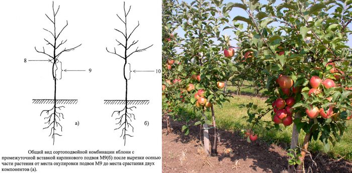 У карликових підщеп є один великий недолік, їх система коренів розташовується дуже близько до поверхні ґрунту, і тому вона може сильно постраждати із-за сильних морозів малосніжною зимою, що нерідко призводить до загибелі дерева. Але від цього недоліку цілком можливо позбутися. Для цього треба застосувати комбінований метод створення карликового яблуневого дерева за допомогою интеркалярной вставки ― це проміжна ланка між підщепою сильнорослою яблуні і сортовим черешком, який є черешком карликового дерева. В результаті створюється триповерхова конструкція: спочатку йде добре розвинена і потужна система коренів сильнорослого яблуневого дерева, потім щеплений на неї держак карликові яблуні, а потім вже щеплений на нього живець культурного сорту. Дерева з подібними вставками можна посадити у відкритий грунт різними способами: