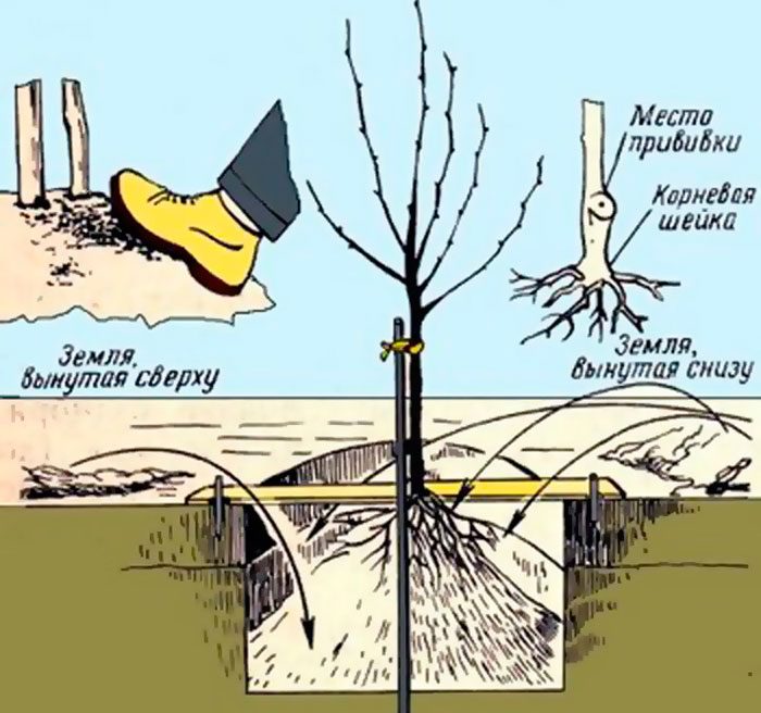У весняний час В серединку котловану необхідно встановити кількість, навколо якого насипається грунт з верхнього шару горбком. На цю гірку встановлюється саджанець і далі посадка проводиться за тим же планом, що і в осінній час.
