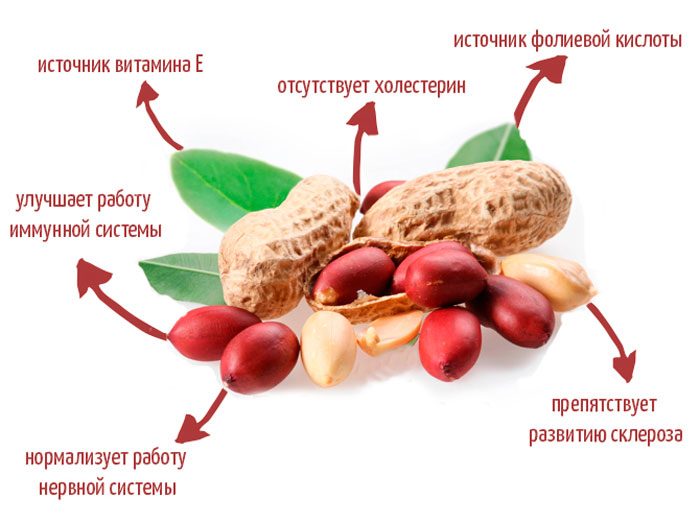 Жири, що входять до складу плодів, відрізняються легким жовчогінним ефектом, тому вони рекомендовані при виразковій хворобі шлунка і при гастриті. Фолієва кислота бере участь у відновленні клітин організму людини. А антиоксиданти, яких в арахісі дуже багато, сприяють захисту клітин від вільних радикалів, а також є чудовою профілактикою захворювань серця, атеросклерозу, ішемії судин, передчасного старіння і формування ракових клітин.