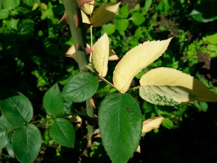 Якщо на поверхні листових пластин утворюються плями жовтого або білого кольору, то це означає, що кущик хворий хлорозом. Він розвивається із-за дефіциту бору, марганцю, магнію, цинку, заліза або інших речовин потрібних шипшині. Приміром, якщо йому не вистачає заліза, то хлоротичний забарвлення з'являється на всій листовій пластинці, крім великих жилок, при цьому хлороз спочатку вражає верхівкові молоді листочки. Якщо відчувається брак цинку, то хлоротичний забарвлення розповсюджується по краю листової пластини, при цьому уздовж бічних і центральної жилки забарвлення листка не змінюється. При дефіциті магнію спостерігається пожовтіння і відмирання листових пластин, а забарвлення жилок залишається зеленим. Якщо рослині не вистачає бору, то тканини молоденьких листових пластин товщають, а ще вони бліднуть і стають крихкими. З'ясуйте, з-за чого розвинувся хлороз, а потім внесіть в грунт потрібний елемент. При бажанні можна підгодувати рослина необхідним елементом позакореневим способом по листю.