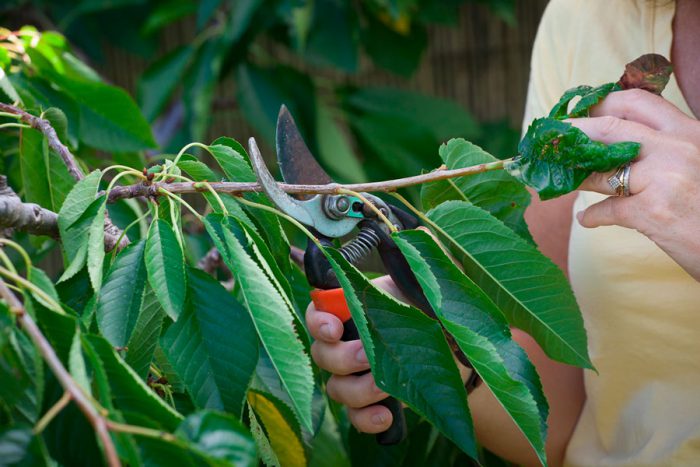 Доглядати за черешнею зовсім не складно, але тільки це не відноситься до обрізку рослини, яку слід проводити правильно, регулярно і з розуміння суті цієї процедури. Обрізку проводять щороку, при цьому починають з першого року життя рослини. Якщо обрізати черешню вчасно і правильно, то в результаті цього підвищується якість плодів, а також їх кількість, поліпшується стійкість до захворювань, а також збільшується тривалість життя дерева. Обрізання рекомендується проводити у весняний час до того, як почнеться сокорух, але при цьому заморозків у нічний час бути не повинно, а вдень повинно бути тепло. Серед садівників існує думка, що обрізати черешню можна тільки навесні, але це далеко не так. Обрізати дану культуру потрібно обов'язково кожен рік, тому якщо у весняний час з якихось причин обрізка не була здійснена, дану процедуру переносять на літо або осінь.