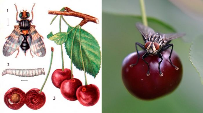 Вишнева муха так само дуже небезпечна для черешні та вишні. Вона може знищити близько 90 відсотків всього врожаю. Личинки такого шкідника з'їдають нектар з квіток, а ще висмоктують сік з ягід, у результаті чого вони руйнуються. Найбільшу небезпеку такий шкідник представляє для середньо - і пізньостиглих сортів черешні. Пошкоджені шкідником ягоди стають темними, починають гнити і обсипаються. Виберуться з опалих плодів личинки зариваються в грунт. Щоб зловити таких мух, використовують спеціальні пастки. Для їх виготовлення використовують фанеру або пластик, їх фарбують у насичено-жовтий колір, а потім обмазують ентомологічним клеєм або вазеліном. Готові пастки розвішують на черешні на висоті 150-200 див. Через 3 дні перевірте пастки, якщо ви на них знайдете не менше 5-7 мух, то обприскати черешню Конфидором або Актеліком. Якщо рослина була опрыскано Конфидором, то повторну обробку цим же засобом проводять через 20 днів після першої, а якщо Актелліком через 15 діб. Останній раз черешню можна обробити не пізніше, ніж за 20 діб до збирання плодів середньо - і пізньостиглих сортів.