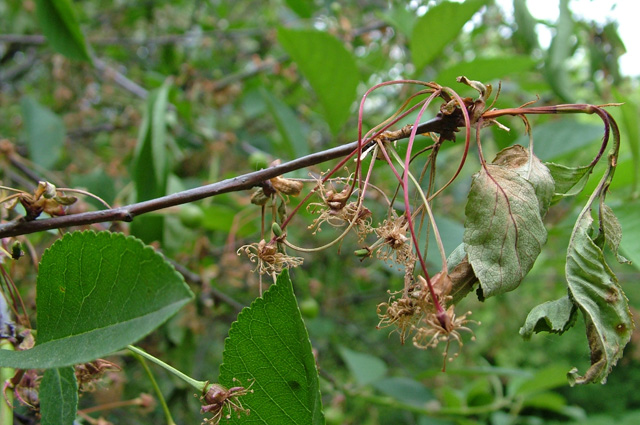Найчастіше кокомікоз вражає саме листя, у більш рідкісних випадках він пошкоджує стебла, ягоди і черешки. У сиру погоду дана хвороба розвивається швидше за все. У червні на поверхні листових пластин з'являються маленькі цятки буро-червоного кольору, з часом вони стають все більше, поки не зливаються один з одним. При цьому уражається практично вся листова пластина, з-за чого листя облітає раніше часу. Якщо дерево уражене дуже сильно, то спостерігається вторинний ріст пагонів. Це захворювання призводить до більш тривалого дозрівання ягід, рослина слабшає, зменшується його морозостійкість, в деяких випадках садівник може повністю втратити врожаю. Перш ніж розкриються бруньки, захворілу черешню слід обробити препаратом, що містить мідь (наприклад: бордоською сумішшю, оксихлоридом міді або мідним купоросом). Під час формування бутонів рослину обприскують розчином Хоруса (на 1 відро води 2-3 грама). Другий раз рослину обприскують Хорусом відразу після того, як воно відцвіте. Через 15-20 днів заражені гілки слід зрізати, при цьому необхідно захоплювати здорову тканину. Дані гілки потрібно обов'язково знищити.