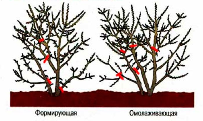 У весняний час проводять санітарну обрізку, для цього видаляють засохлі, травмовані і уражені хворобою гілки і стебла. Молодим рослинам потрібна формувальне обрізання, при цьому садівник повинен вибрати, як він буде формувати рослина: кущем або деревцем. Для формування чагарнику тільки що висаджений саджанець необхідно обрізати на висоту від 10 до 20 сантиметрів. На пеньку повинна з'явиться поросль, а також вона зросте від кореня, на наступний рік з них потрібно буде вибрати 4 найпотужніших втечі, а решта вирізати. При цьому слід врахувати, що кореневі пагони слід залишати лише у кореневласних рослин.