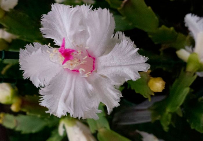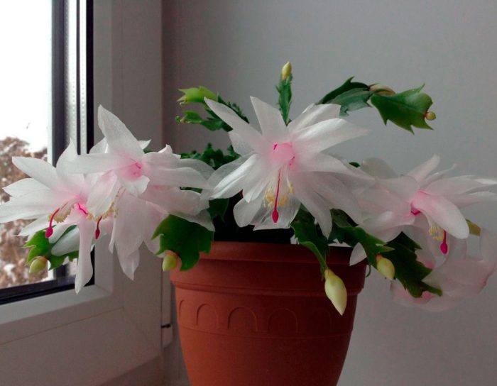 Декабрист сорту «Білий» виглядає дуже ніжно і одночасно ошатно. Зазвичай така рослина рясно цвіте. Деколи під бутонами не видно стебел і листя. Квіти біля «Білого» великі.