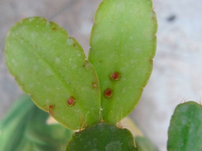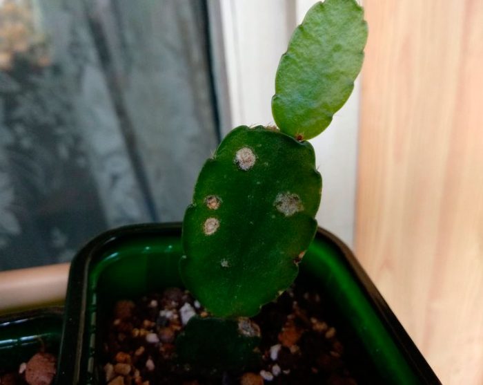 - Відмирання і облетание сегментів. У деяких випадках можуть почати відмирати і опадати листя у, здавалося б, вчиненого здорового куща. Найбільш часто відмирання сегментів пов'язано з тим, що на кущі оселився павутинний кліщ. У тому випадку, якщо шкідник не був знайдений, тоді «листопад» може бути пов'язаний з нестачею поживних речовин (занадто бідний субстрат або дуже рідкі підгодівлі). У цьому випадку кущ потрібно 1-2 рази підживити по листу розчином добрив для епіфітних кактусів, потім його вносять і в субстрат. Якщо навіть після такого підживлення опадання сегментів продовжиться, тоді доведеться пересадити рослину в свіжу грунтосуміш. Якщо облітають кінцеві сегменти, то причиною цього може стати надмірно низька вологість повітря або стрес (зміна середовища, різке коливання добових температур, несвоєчасно проведена пересадка або протяг).