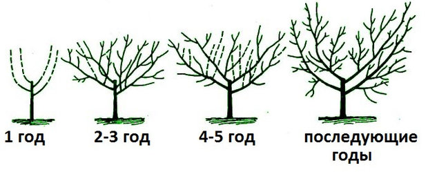 Як правило, кроні дерева надають форму вази, або чаші. Завдяки даній формі крона стає міцнішою, а ще з такого рослини легше знімати плоди і простіше доглядати. Формировкой крони займаються навесні протягом перших 4-5 років. Спочатку закладають скелетні гілки. У перший рік необхідно відібрати 2 або 3 гілки з широким кутом відходження, вони піддаються укорочення до 10 сантиметрів на зовнішні нирки, при цьому всі інші гілки потрібно вирізати. Кожен рік слід додавати по 2 або 3 скелетні гілки, які повинні розташовуватися під потрібним кутом. Сформуйте розгалуження першого порядку на торішніх скелетних гілках, другого порядку ― на позаторішніх і т. д.