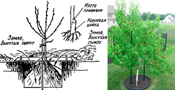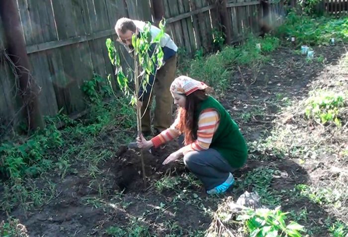 На горбок, який був насипаний в центрі дна ями, потрібно встановити саджанець. Коли його корінці будуть акуратно розправлені, яму потрібно наповнити залишилася землесумішшю. При висадці рослинки простежте за тим, щоб місце щеплення височіло над рівнем поверхні ділянки на 30-40 мм. Добре утрамбуйте грунт від країв ямки до центру, а потім влийте отриману «лунку» 40-50 л води. Після того як рідина повністю вбереться, місце щеплення повинно бути на одному рівні з поверхнею грунту. Після цього деревце підв'язують до кілка, а потім проводять його підгортання на висоту 0,2–0,3 м і використовують для цього сухий грунт. На зиму поверхню пристовбурового кола необхідно засипати шаром мульчі (компостом), товщина якого повинна бути від 8 до 10 сантиметрів.