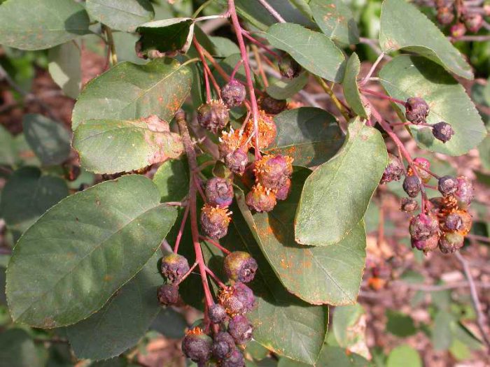 У тому випадку, якщо ірга уражається филлостиктозной плямистістю, то на поверхні засохлою і відмерлої листя можна буде побачити коричнево-бурі плями. Заражену листя слід обірвати і спалити. До і після цвітіння кущі треба обприскати бордоською сумішшю.